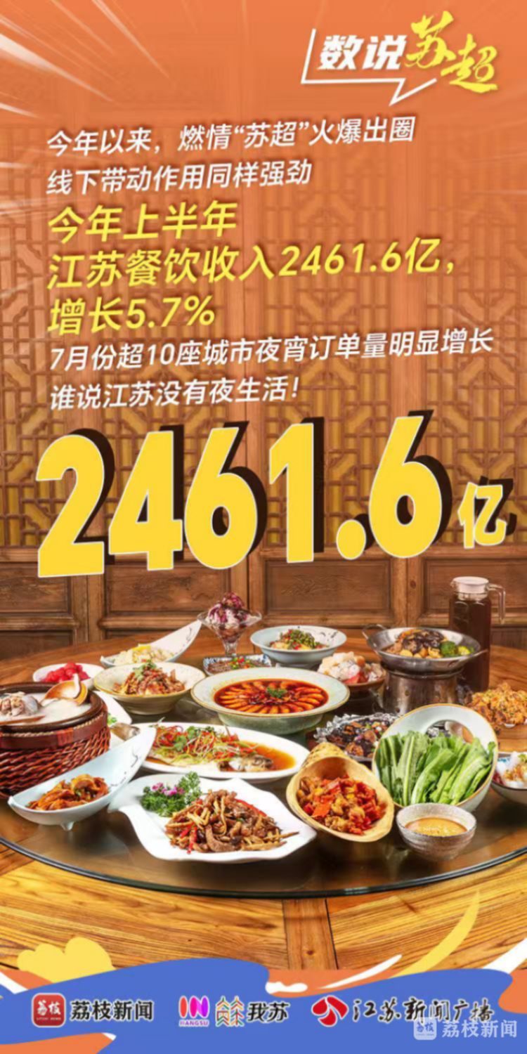 苏超带动下夜游夜经济的多元业态呈现 餐饮消费的火爆场景 在苏超的带动下,餐饮消费迎来了爆发式增长。今年上半年,江苏餐饮收入 2461.6 亿,占全国 8.9%,领跑长三角,增长 5.7%,增速高于全国,7 月份超 10 座城市夜宵订单量明显增长。各地围绕苏超推出了一系列美食活动。连云港在赛事期间,重点监测的 20 家餐饮企业周末上座率较平时周末增长 38%,赛事时段上座率更是达到 95% 以上。扬州冶春御马头店打造全国首个 “园林足球主题夜市”,球迷们可以夜游北护城河灯影长廊,品味地道淮扬菜,活动日均吸引超 3000 人,提升了淮扬美食的知名度。盱眙在淮安队主场对战南京队期间,举办为期 3 天的欢乐龙虾宴,超万名食客剥食 103 吨小龙虾,某龙虾馆负责人表示准备了 2 吨龙虾,1 个小时就卖完了,补货 3 次还是供不应求。无论是高端餐厅还是街头小吃摊,都在苏超的带动下生意兴隆,啤酒、烧烤、小龙虾等美食成为球迷们观赛时的标配,餐饮消费成为苏超带动夜游夜经济的重要一环。