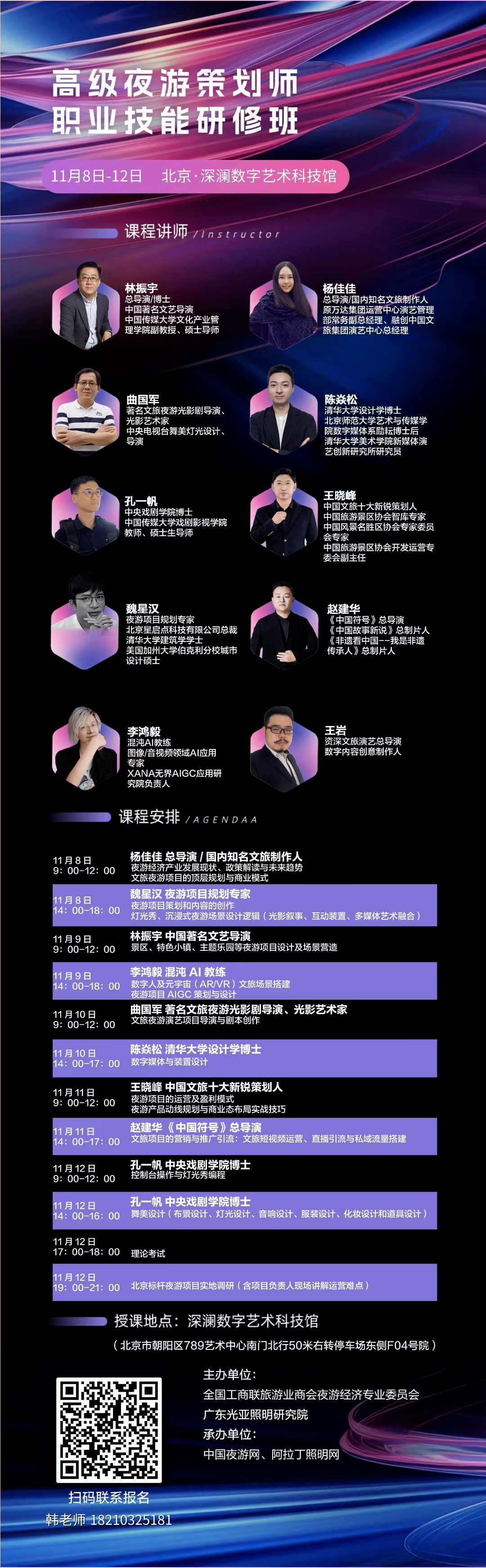 王岩 资深文旅演艺总导演 数字内容创意制作人 长治太行欢乐谷魔幻剧场”梁祝“剧目总导演 长治太行欢乐谷太行不夜城总规划 郑州商代文化遗址广场夜游部分规划设计 2024年九华山大愿文化园跨年活动总导演 济南华谊兄弟电影小镇演艺项目总导演 福建平潭台湾小镇大型演出“日月潭传奇”总导演 沈阳愤怒小鸟主题乐园数字内容导演 抚顺丰远热高海底两万里"闭幕秀"总导演 哈尔滨规划馆规划设计天洋梦东方燕郊未来城规划设计 天洋集团梦东方嘉善室内乐园设计 永昌乐地集团秦皇岛项目总规设计 南京仁恒文旅度假区极地海洋公园 南京仁恒江岛置业有限公司主题包装设计抚顺丰远热高乐园梦幻世界总规设计沈阳愤怒小鸟主题乐园规划设计 无论你是文旅行业从业者(景区运营、文旅公司策划),想提升夜游项目创新能力;还是创业者 / 投资者,想布局夜游赛道却缺乏专业知识;导师都会根据你的基础与需求,提供“理论讲解 + 案例拆解 + 实战模拟”三位一体的教学模式。课后还会提供答疑指导,帮你解决实际策划中遇到的难题。 跟着导师学,你能收获: 一套系统化的夜游策划方法论,从前期调研到后期运营全掌握; 20+个成功夜游项目的核心拆解,学习可复用的创意与运营逻辑; 专属人脉资源:进入导师的行业交流圈,链接项目方、供应商、流量平台资源; 实战机会:优秀学员可参与导师的真实项目策划,积累落地经验,为简历加分。 现在行动,抢占文旅夜经济红利先机! 报名联系人