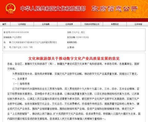 截图来源:文化和旅游部网站 《意见》指出,数字文化产业规模持续壮大,产业结构不断优化,供给质量不断提升,成为激发消费潜力的新引擎。产业基础设施更加完备,支撑平台更加成熟,创新创业更加活跃,市场秩序更加有序,治理能力不断提升,创造更多新就业形态和新就业岗位,形成适应新技术新业态新消费发展、产业链上下游和跨行业融合的数字化生产、流通、消费生态体系。文化产业和数字经济融合发展迈向新阶段,数字化、网络化、智能化发展水平明显提高,形成新动能主导产业发展的新格局,数字文化产业发展处于国际领先地位。 《意见》要求,到2025年,培育20家社会效益和经济效益突出、创新能力强、具有国际影响力的领军企业,各具特色、活力强劲的中小微企业持续涌现,打造5个具有区域影响力、引领数字文化产业发展的产业集群,建设200个具有示范带动作用的数字文化产业项目。 夯实数字文化产业发展基础 《意见》提出,加强内容建设。深刻把握数字文化内容属性,加强原创能力建设,创造更多既能满足人民文化需求、又能增强人民精神力量的数字文化产品。培育和塑造一批具有鲜明中国文化特色的原创IP,加强IP开发和转化,充分运用动漫游戏、网络文学、网络音乐、网络表演、网络视频、数字艺术、创意设计等产业形态,推动中华优秀传统文化创造性转化、创新性发展,继承革命文化,发展社会主义先进文化,打造更多具有广泛影响力的数字文化品牌。强化文化对旅游的内容支撑、创意提升和价值挖掘作用,提升旅游的文化内涵。以优质数字文化产品引领青年文化消费,创作满足年轻用户多样化、个性化需求的产品与服务,增强青年民族自豪感和文化自信心。 《意见》明确,加快新型基础设施建设。支持面向行业通用需求,建设数据中心、云平台等数字基础设施,完善文化产业“云、网、端”基础设施,打通“数字化采集—网络化传输—智能化计算”数字链条。鼓励数字文化企业参与企业级数字基础设施开放合作,完善文化产业领域人工智能应用所需基础数据、计算能力和模型算法,推动传统文化基础设施转型升级。加强APP、小程序等移动互联网基础设施建设,完善文化领域数字经济生产要素,促进产业互联互通。主动对接新基建,用好新基建政策、平台、技术,提升数字文化产业发展水平。 《意见》提到,推动技术创新和应用。围绕数字文化产业技术创新需求,集聚文化和旅游部重点实验室、骨干企业、高校院所、研究院、研发中心等创新机构资源,加快数字化转型共性技术、关键技术研发应用。支持建立产学研用协同合作的产业技术创新联盟,推动跨行业、跨部门、跨地域成果转化。支持5G、大数据、云计算、人工智能、物联网、区块链等在文化产业领域的集成应用和创新,建设一批文化产业数字化应用场景。推进企业、高校、科研机构间技术要素流动,鼓励通过许可、转让、入股等方式推动技术要素向中小微企业转移。 《意见》称,激发数据资源要素潜力。支持文化企业升级信息系统,建设数据汇聚平台,推动全流程数据采集,形成完整贯通的数据链。支持上下游企业开放数据,引导和规范公共数据资源开放流动,打通传输应用堵点,提升数据流通共享商用水平。构建文化领域数据开发利用场景,建设可信数据流通环境,培育数据要素市场。推动文化大数据采集、存储、加工、分析和服务等环节产品开发,发展数据驱动的新业态新模式,打造文化数据产品和服务体系。加强文化消费大数据分析运用,促进供需调配和精准对接。强化数据安全,构建文化数据安全责任体系,引导企业增强数据安全服务,提高数据规范性和安全性。 《意见》指出,培育市场主体。培育一批具有较强核心竞争力的大型数字文化企业,引导互联网及其他领域龙头企业布局数字文化产业。支持“新技术、新业态、新模式”企业发展,扶持中小微数字文化企业成长,培育一批细分领域的“瞪羚企业”和“隐形冠军”企业。发挥产业孵化平台和龙头企业在模式创新和融合发展中的带动作用,通过生产协作、开放平台、共享资源等方式,带动上下游中小微企业发展。引导支持文化企业加大对数字技术应用的研发投入,支持自主或联合建立技术中心、设计中心等机构,推动产品服务和业务流程改造升级。 《意见》要求,构建产业标准体系。实施标准化战略,加强数字文化技术标准应用,以标准建设促进产业发展。发挥标准对产业的引导支撑作用,推动虚拟现实、交互娱乐、智慧旅游等领域产品、技术和服务标准研究制定,形成数字文化产业标准体系。加快我国标准国际化进程,加强手机(移动终端)动漫国际标准和数字艺术显示国际标准应用推广。 培育数字文化产业新型业态 《意见》提出,促进优秀文化资源数字化。对文化资源进行数字化转化和开发,让优秀文化资源借助数字技术“活起来”,将所蕴含的价值内容与数字技术的新形式新要素结合好,实现创造性转化和创新性发展。支持文化场馆、文娱场所、景区景点、街区园区开发数字化产品和服务,将创作、生产和传播等向云上拓展。支持文物、非物质文化遗产通过新媒体传播推广,鼓励线下文艺资源、文娱模式数字化,创新表现形式,深化文化内涵。鼓励依托地方特色文化资源,开发具有鲜明区域特点和民族特色的数字